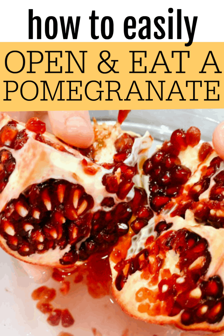 Wondering how to cut open pomegranate easily and how to eat pomegranate? Full tutorial on how to cut and de-seed a pomegranate, eating pomegranate, and pomegranate recipe ideas. Learning how to open a pomegranate with your hands is super fun food kids activities for holidays and cooking project with kids! Use these pomegranate eating tips for a healthy fruit snack for kids and for easy fruit recipes (perfect for holiday foods, too) and other ideas on what to do with pomegranate seeds.